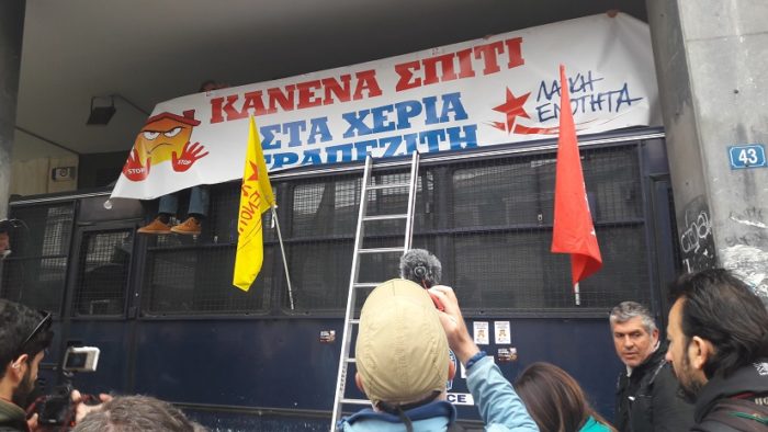 Στελέχη της ΛΑ.Ε. ανέβηκαν για άλλη μια φορά στην κορυφή αστυνομικής κλούβας, που παράνομα και αυθαίρετα είχε τοποθετηθεί πάνω στο πεζοδρόμιο μπροστά στη στοά επί της Σταδίου 43, που βρίσκεται συμβολαιογραφείο, το οποίο πραγματοποιούσε ηλεκτρονικούς πλειστηριασμούς λαϊκής περιουσίας, σήκωσαν και κράτησαν για πολύ ώρα ανοιγμένο πανό της ΛΑ.Ε. που ανέγραφε ”Κανένα σπίτι στα χέρια τραπεζίτη”.