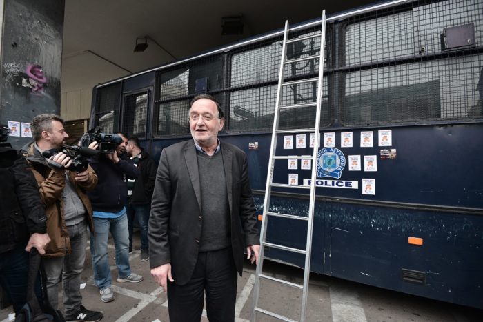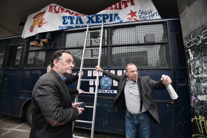 Πλειστηριασμοί: Κρέμασαν πανό και σημαίες στην οροφή της κλούβας των ΜΑΤ