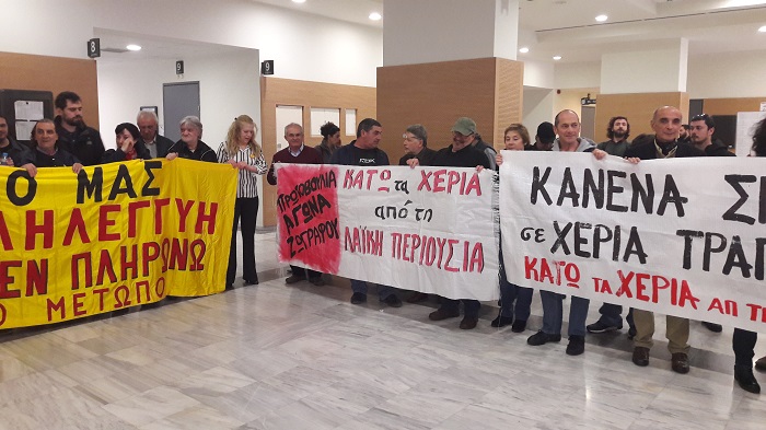 Στην Αθήνα με τον Παναγ. Λαφαζάνη, τον Λεων. Παπαδόπουλο και άλλους αγωνιστές στην πρώτη γραμμή υποχρεώθηκαν κάτω από συνεχή συνθήματα να αποχωρήσουν οι δύο συμβολαιογράφοι από την έδρα των πλειστηριασμών.