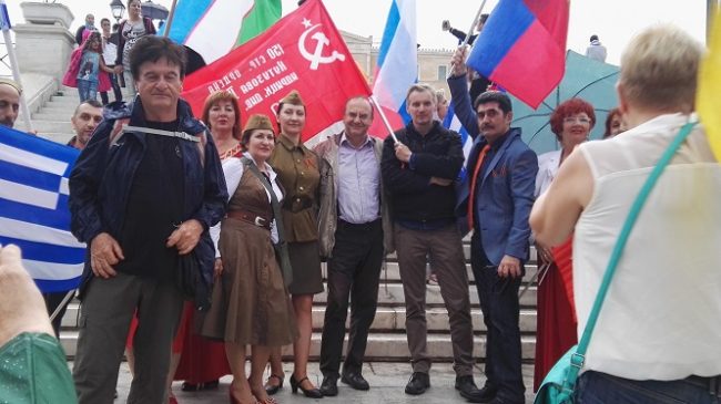 Σοβιετικές και ελληνικές σημαίες αλλά και σημαίες από πολλές άλλες χώρες σηματοδοτούσαν το μεγάλο αντιφασιστικό μέτωπο, που με επικεφαλής τη Σοβιετική Ένωση και τον κόκκινο στρατό τσάκισαν τη ναζιστική φασιστική απειλή.
