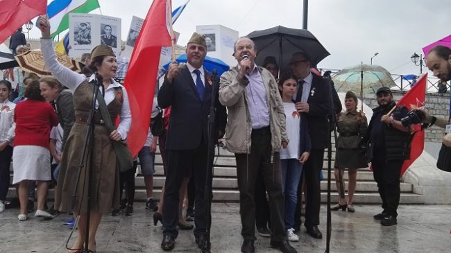 Αγωνιστική και πετυχημένη – παρά τη δυνατή βροχή που έπεφτε καθόλη τη διάρκειά της – η εκδήλωση της Αθάνατης Στρατιάς, που διοργάνωσε η Ομοσπονδία Συλλόγων Μεταναστών από τις χώρες της πρώην ΕΣΣΔ στο Σύνταγμα την Κυριακή (6/5).