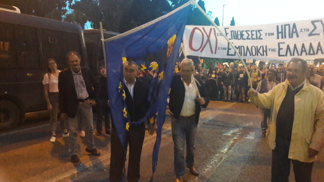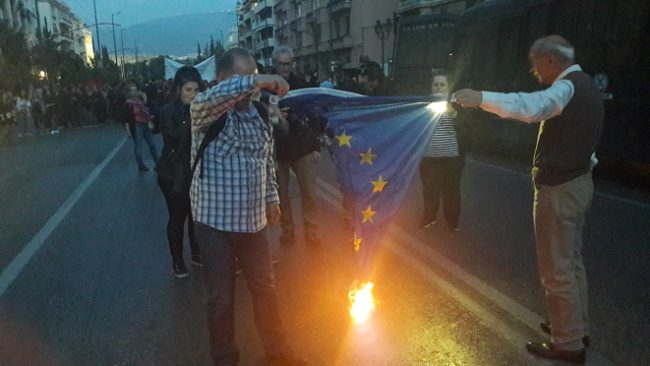 Στο ύψος των γραφείων της ΕΕ διαδηλωτές από το μπλοκ της ΛΑ.Ε έκαψαν σημαίες της Ευρωπαϊκής Ένωσης.