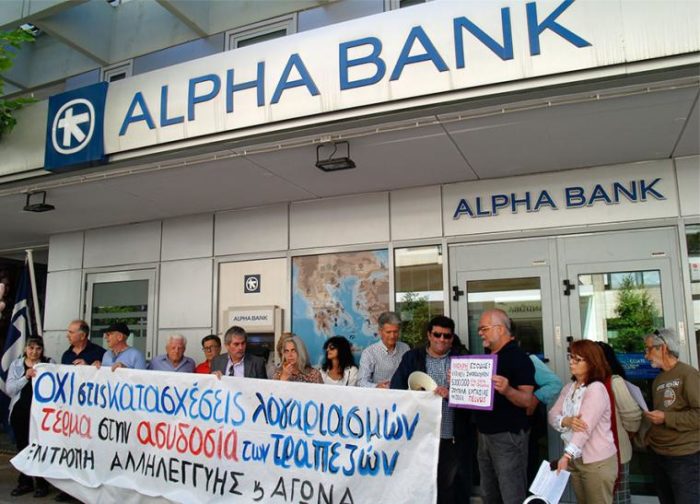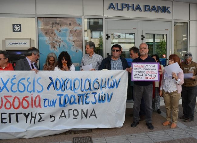 Καταγγέλλουμε τις τράπεζες και πρώτα απ’ όλες την ALPHA BANK οι οποίες προχωρούν ακόμη και σε παράνομες κατασχέσεις λογαριασμών, όπως έγινε τον Απρίλιο για πάρα πολλούς συνταξιούχους. Παρότι ο νόμος είναι ρητός και κατηγορηματικός για ακατάσχετο έως 1.000 € για σύνταξη και 1.250 € για κατάθεση ανά φυσικό πρόσωπο σε ατομικό ή κοινό λογαριασμό η ALPHA BANK προχώρησε σε συνεργασία με την Ανεξάρτητη Αρχή Δημοσίων Εσόδων (Δ.Ο.Υ. Καλαμάτας) σε κατάσχεση της μισής σύνταξης των 800 € σε πάρα πολλούς συνταξιούχους και τα απέδωσε στο Δημόσιο όπως π.χ. στην κα Γιώτα Καλομοίρη κάνοντας παρανομία. Ερμήνευσε αυθαίρετα και παράνομα ότι η σύνταξη δεν ανήκει στην δικαιούχο, αλλά ανήκει και στους δύο συζύγους κατά το ήμισυ!!! Αυτό όμως ήταν μια καραμπινάτη παρανομία και η Εισαγγελία Καλαμάτας ξεκίνησε αυτεπάγγελτα τη διαδικασία έρευνας για ποινικές ευθύνες της τράπεζας.