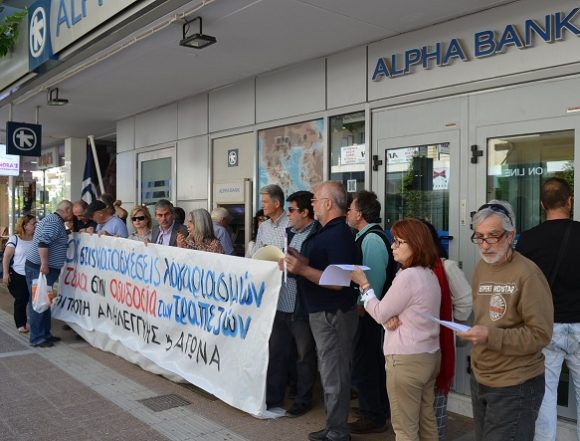 Η Επιτροπή Αλληλεγγύης και Αγώνα Μεσσηνίας οργάνωσε σήμερα Πέμπτη 10 Μαΐου 2018 στις 11 π.μ. συγκέντρωση διαμαρτυρίας μπροστά από την τράπεζα Alpha Bank στην Καλαμάτα για να καταγγείλει τις παράνομες ενέργειες της Alpha Bank και όλων των τραπεζών, οι οποίες παρανόμως προχωρούν σε κατάσχεση ακόμη και ακατάσχετων λογαριασμών.