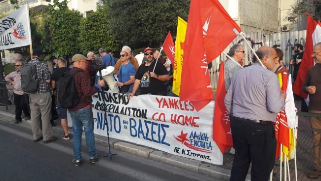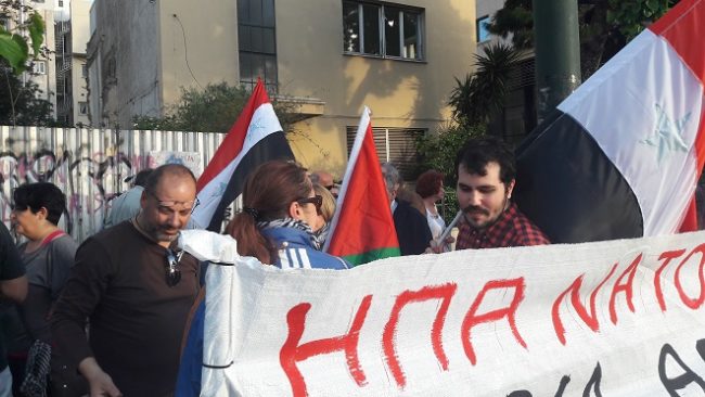Οι διαδηλωτές κατάγγειλαν, επίσης, την κυβέρνηση Τσίπρα – Καμμένου και το μνημονιακό μπλοκ, οι οποίοι μετέτρεψαν την Ελλάδα σε αμερικανικό στρατιωτικό προτεκτοράτο και προσέφεραν τις πάμπολλες αμερικανικές βάσεις της χώρας, ιδιαίτερα την Σούδα, για να στηρίξουν την βρώμικη πυραυλική επίθεση στην Συρία.
