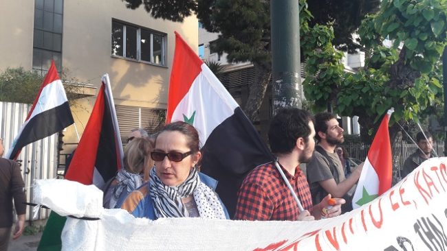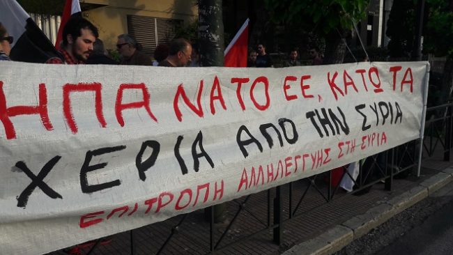 Οι διαδηλωτές φώναζαν συνθήματα ενάντια στον αμερικανικό ιμπεριαλισμό και τους πρόθυμους συμμάχους του, Γαλλία και Βρετανία και ενάντια στην ΕΕ που στήριξε την βρώμικη πυραυλική επίθεση στην Συρία.