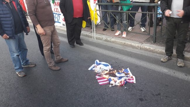 Στην διάρκεια της διαμαρτυρίας, Παλαιστίνιοι και Έλληνες πολίτες έκαψαν συμβολικά μπροστά στην αμερικανική πρεσβεία αμερικανικές και ισραηλινές σημαίες σε ένδειξη καταγγελίας των αντίστοιχων ειδεχθών ιμπεριαλιστικών και σιωνιστικών κυβερνήσεων των ΗΠΑ και του Ισραήλ.