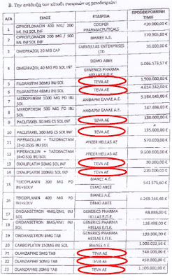 – Είναι, όμως, και η εποχή που ο Ελληνας ασθενής παραδίδεται στο πιάτο της Teva (της εταιρείας που εκθείαζε, όλα τα τελευταία χρόνια, ο κ. Μόσιαλος). Η αρχή γίνεται μέσω των διαγωνισμών για την προμήθεια φαρμάκων στα ελληνικά δημόσια νοσοκομεία. Οι όροι τους –που πλέον επιλέγουν μόνο βάση της τιμής και όχι της ποιότητας- είναι βούτυρο στο ψωμί της Teva. Απόδειξη; Η ισραηλινή εταιρεία σαρώνει στη δεύτερη ηλεκτρονική δημοπρασία, κερδίζοντας τα εννέα (9) από τα 23 σκευάσματα! Ναι, πρόκειται για την εταιρεία που φιγουράριζε ως «πρότυπο» στις μελέτες δια χειρός Μόσιαλου. Την ίδια εταιρεία που ξεμπρόστιασε για νοθευμένα φάρμακα ο Αμερικανικός Οργανισμός Φαρμάκων!
