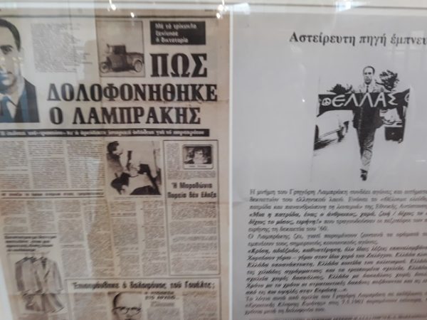 Ο απόρρητος φάκελος της Ασφάλειας για τον Γρηγόρη Λαμπράκη εκτίθεται στο Μουσείο Εθνικής Αντίστασης στην Ηλιούπολη ενώ τα ματωμένα ρούχα του στο Εκθεσιακό Κέντρο του Δήμου Ηλιούπολης.