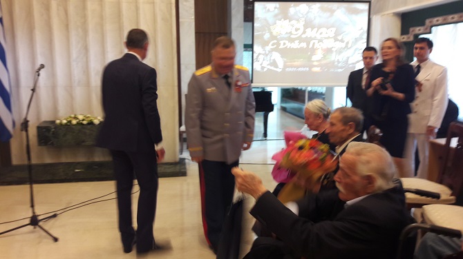 Στην δεξίωση της Ρώσικης πρεσβείας μίλησε ο πρέσβης της Ρωσίας στην Αθήνα Αndrei Maslov, ο οποίος και τίμησε ιδιαίτερα τους αντιστασιακούς της Ελλάδας και πρώτα απ’ όλα τον Μανώλη Γλέζο, ο οποίος στο σύντομο χαιρετισμό του υπενθύμισε τα λόγια του στρατάρχη του Σοβιετικού στρατού Semyon Mikhailovich Budyonny, που τόνισε ότι ‘‘ο Σοβιετικός στρατός έπιασε αιχμαλώτους απ’ όλες τις φυλές του Ισραήλ, εκτός μόνο από Έλληνες, διότι οι Έλληνες μόνο δεν πολέμησαν στο πλάι των Γερμανών ναζί ενάντια στην Σοβιετική Ένωση”!