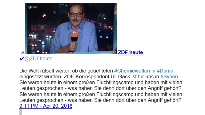ZDF heute: « Ο κόσμος εξακολουθεί να προβληματίζεται με το εάν τα απαγορευμένα χημικά όπλα χρησιμοποιήθηκαν στην Ντούμα. Ο ανταποκριτής του ZDF, Uli Gack βρίσκεται στη Συρία για εμάς: ΄Ησουνα σήμερα σε ένα μεγάλο κέντρο προσφύγων και μίλησες με πολύ κόσμο. Τι άκουσες εκεί για την επίθεση;» Ο Gack απάντησε: «Η χημική επίθεση στην Ντούμα είναι πιθανότατα σκηνοθετημένη, πάρα πολλοί άνθρωποι εκεί μοιάζουν πολύ πεπεισμένοι.»