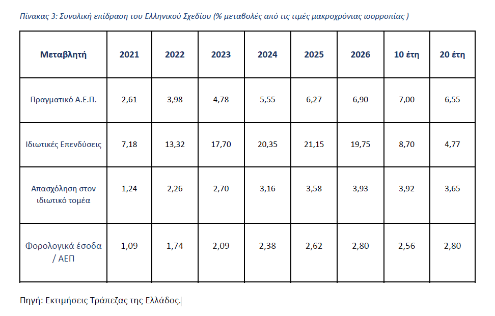 Δηλαδή, τα 19 δισ. ευρώ επιχορηγήσεων και 13 δισ. ευρώ εγγυημένων δανείων (σύνολο 32) του ταμείου Ευρωανάκαμψης, που θα κινητοποιήσουν πόρους (ιδιωτικούς) 25 δισ. ευρώ, ήτοι 57 δισ. ευρώ, συνολικά θα προσθέσουν στην ελληνική ανάπτυξη μόνο 7% στο ΑΕΠ και μόνο «180.000-200.000 νέων καλών μόνιμων θέσεων εργασίας μέχρι το 2026».