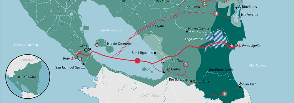 Σύμφωνα με την αρχική μελέτη, η Διώρυγα θα διασχίσει τη Μεγάλη Λίμνη Cocibolca και των παραποτάμων (του ποταμού San Juan) , τη ζώνη ελεύθερου εμπορίου του Brito, το τουριστικό συγκρότημα του San Lorenzo και το αεροδρόμιο Rivas, που συνδέει τα δύο λιμάνια στον Ειρηνικό και την Καραϊβική.