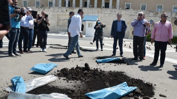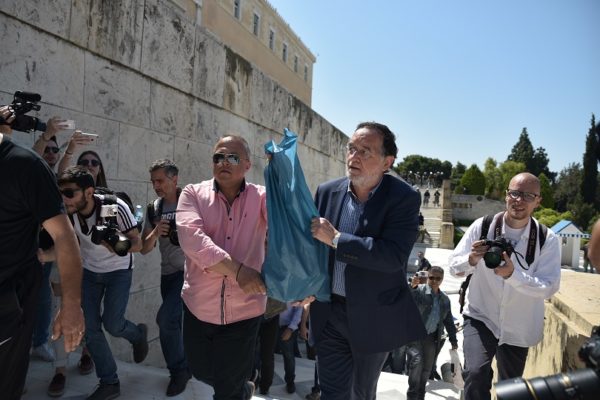 Στη συνέχεια οι εργαζόμενοι της ΔΕΗ κατευθύνθηκαν στο Σύνταγμα στην οδό Αμαλίας και μπροστά στον Άγνωστο Στρατιώτη και στις σκάλες που οδηγούν στη Βουλή, μπροστά στα ΜΑΤ, πέταξαν και άδειασαν, μαζί με τον Παναγ. Λαφαζάνη, σακούλες γεμάτες λιγνιτική σκόνη από τα ορυχεία της Μεγαλόπολης και της Φλώρινας.