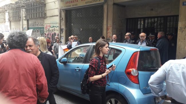 Μέλη της ΛΑ.Ε. αιφνιδίασαν και απέτρεψαν την τοποθέτηση αστυνομικής κλούβας μπροστά σε συμβολαιογραφείο στην Καποδιστρίου 18