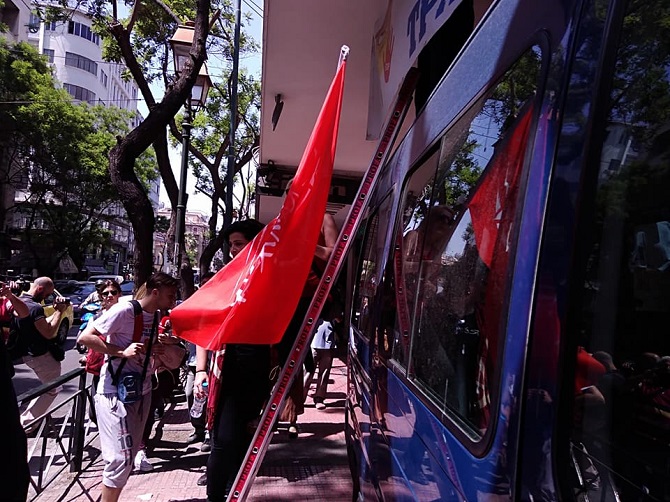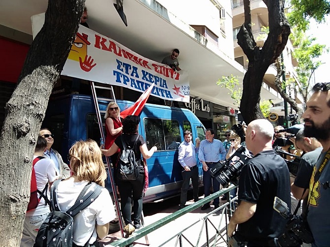 Μέλη της ΛΑ.Ε. με πανό στην οροφή αστυνομικού βαν σε νέα αγωνιστική κινητοποίηση κατά των πλειστηριασμών