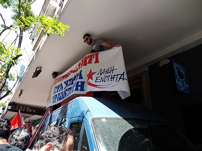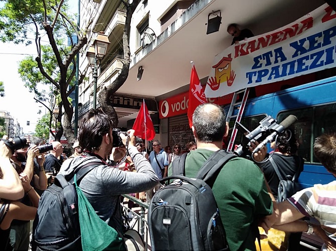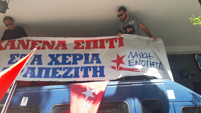 Τα μέλη της ΛΑ.Ε σήκωσαν και κράτησαν στην οροφή του αστυνομικού βαν για πολύ ώρα ανοιγμένο πανό της ΛΑ.Ε. που ανέγραφε ”Κανένα σπίτι στα χέρια τραπεζίτη”.