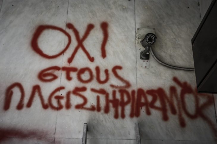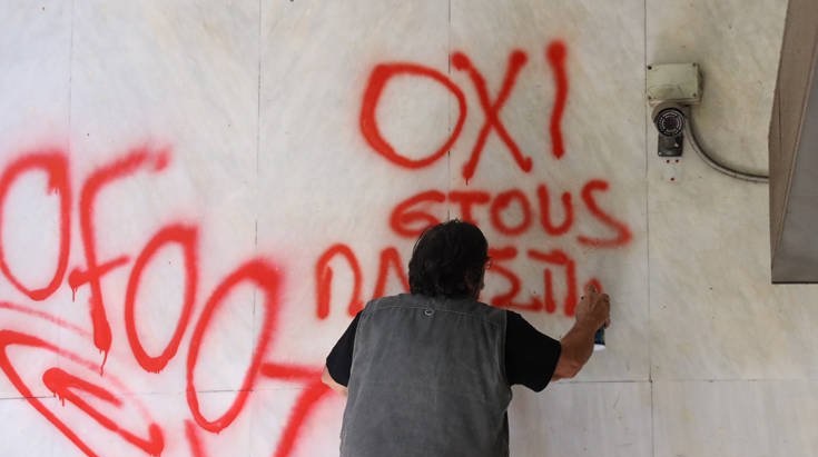 Τελικά οι διαδηλωτές ανέγραψαν τα συνθήματά τους λίγο πιο δίπλα, στην πρόσοψη πάντως του Υπουργείου και της γειτονεύουσας Εθνικής Τράπεζας.