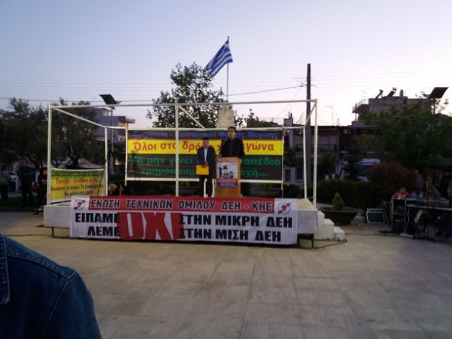 Τη συγκέντρωση άνοιξε με χαιρετισμό του ο Παν.Λαφαζάνης, Γραμματέας του Π.Σ της ΛΑ.Ε, στη συνέχεια μίλησαν ο Ν. Γόντικας, περιφερειακός σύμβουλος του ΚΚΕ, ο Κ. Μανιάτης, πρόεδρος της ΕΤΕ-ΔΕΗ, ο Σαρ. Αλεξανδρής, εκπρόσωπος των εργαζομένων της ΔΕΗ στη Μεγαλόπολη, ο Αντ. Καρράς, ΓΓ της ΓΕΝΟΠ-ΔΕΗ και την συγκέντρωση έκλεισε ο δήμαρχος της Μεγαλόπολης, Διον. Παπαδόπουλος.