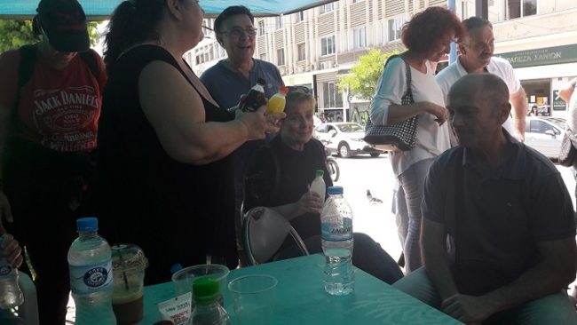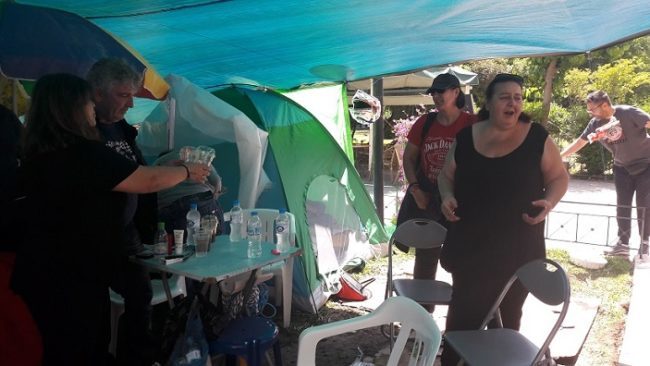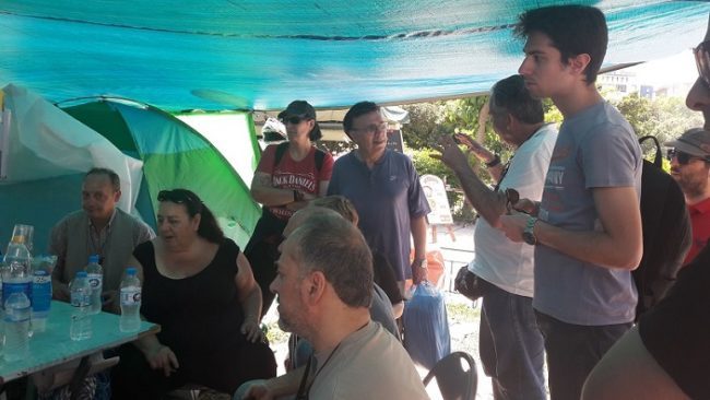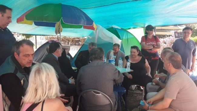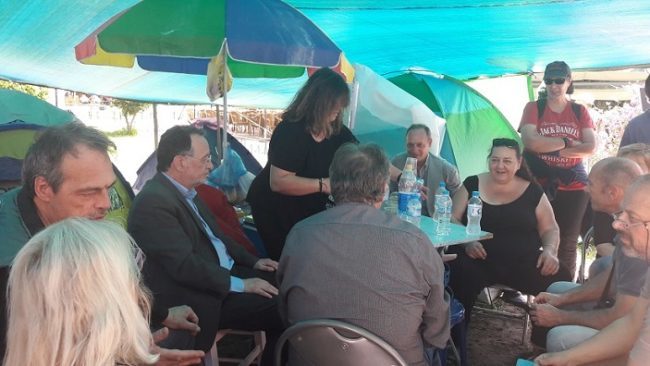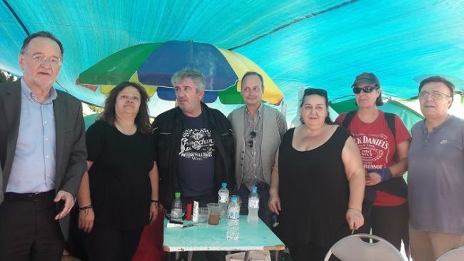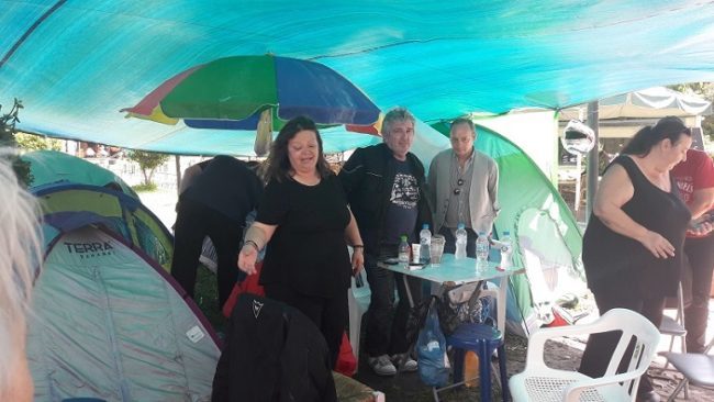 Τους απολυμένους συμβασιούχους καθαριότητας των ΟΤΑ, οι οποίοι απολύθηκαν και πετάχτηκαν στο δρόμο και οι οποίοι διαμαρτύρονται έξω από το Υπ. Εργασίας, εγκατεστημένα σε σκηνές στην Πλ. Κλαυθμώνος, επισκέφτηκε μεγάλη αντιπροσωπεία στελεχών της ΛΑ.Ε με επικεφαλής τον Παν. Λαφαζάνη.