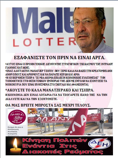 *ΑΥΤΟΣ ΕΙΝΑΙ Ο ΠΡΩΗΝ ΓΕΝΙΚΟΣ ΔΙΕΥΘΥΝΤΗΣ ΣΤΡΑΤΗΓΙΚΟΥ ΣΧΕΔΙΑΣΜΟΥ ΤΗΣ ΙΝΤΡΑΛΟΤ ΓΙΑΝΝΗΣ ΚΑΤΑΚΗΣ. *ΕΝΑΣ ΑΔΙΣΤΑΚΤΟΣ ΜΑΝΑΤΖΕΡ ΤΖΟΓΟΥ ΠΟΥ ΞΕΡΕΙ ΚΑΛΑ ΝΑ ΒΑΖΕΙ ΣΤΗ ΚΡΕΑΤΟΜΗΧΑΝΗ ΑΝΘΡΩΠΟΥΣ ΚΑΙ ΑΡΙΘΜΟΥΣ ΚΑΙ ΝΑ ΠΑΡΑΓΕΙ ΚΕΡΔΗ ΚΑΙ ΑΙΜΑ *Η ΚΥΒΕΡΝΗΣΗ ΤΣΙΠΡΑ ‘’ΣΕ ΜΙΑ ΑΚΟΜΑ ΕΠΙΔΕΙΞΗ ΚΟΙΝΩΝΙΚΗΣ ΕΥΑΙΣΘΗΣΙΑΣ’’ ΤΟΝ ΤΟΠΟΘΕΤΗΣΕ ΣΤΗ ΘΕΣΗ ΓΕΝΙΚΟΥ ΕΜΠΟΡΙΑΣ ΤΗΣ ΔΕΗ ΜΕ ΕΝΤΟΛΗ ΝΑ ΕΞΟΝΤΩΣΕΙ ΤΑ ΝΟΙΚΟΚΥΡΙΑ ΠΟΥ ΕΙΝΑΙ ΒΥΘΙΣΜΕΝΑ ΣΤΟ ΣΚΟΤΑΔΙ ΚΑΙ ΑΦΑΝΙΖΟΝΤΑΙ.