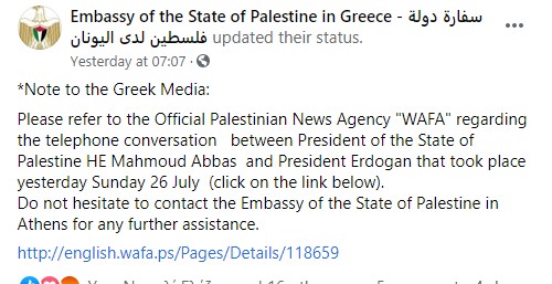 Η πρεσβεία της Παλαιστίνης στην Ελλάδα εφιστά την προσοχή του ελληνικού κοινού, να βασίζονται για πληροφορίες μόνο στις επίσημες ανακοινώσεις της.
