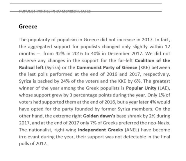 “Ο μεγαλύτερος νικητής του έτους μεταξύ των Ελλήνων λαϊκιστών είναι η Λαϊκή Ενότητα (ΛΑ.Ε.), της οποίας η υποστήριξη αυξήθηκε κατά 3% κατά την διάρκεια τους έτους. Μόνο 1% των ψηφοφόρων την είχαν υποστηρίξει στο τέλος του 2016, αλλά ένα χρόνο αργότερα 4% θα επέλεγε το κόμμα που ιδρύθηκε από πρώην μέλη του ΣΥΡΙΖΑ.”