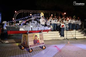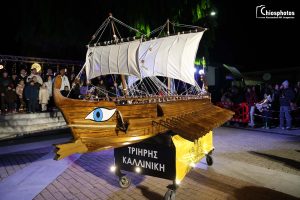 Πλήθος κόσμου κατέβηκε στην κεντρική πλατεία της Χίου την παραμονή της πρωτοχρονιάς για να παρακολουθήσει τα αγιοβασιλιάτικα καραβάκια. Με αυξημένες συμμετοχές, έντονο ενδιαφέρον αλλά και πρωτότυπες κατασκευές όπως πλοία τριήρεις και ιστιοφόρο διεξήχθη για ακόμα μία χρονιά το μοναδικό αυτό έθιμο της Χίου. Φέτος συμμετείχαν 19 πολεμικά και εμπορικά πλοία από 13 ενορίες-συνοικίες. Τα παιδιά από τις ενορίες της Παναγίας Λέτσαινας, Αγίας Παρασκευής Καστέλο, Παναγίας Βοήθειας, Αγίου Γεωργίου Φρουρίου, Αγίου Χαράλαμπου Βαρβασίου, Παναγίας Ευρετής, Παναγίας Τουρλωτής, Αγίου Σπυρίδωνα, Αγίου Ματθαίου Κοφινά, Αγίου Νικολάου Φραγκομαχαλά, Παναγίας Ερειθιανής, Βερβεράτου αλλά και της ΑΕΝ Πλοιάρχων Οινουσσών έβαλαν όλη τους την τέχνη και το μεράκι κατασκευάζοντας εντυπωσιακά ομοιώματα πολεμικών και εμπορικών πλοίων. Ξεχωριστά ήταν και τα παινέματα των πληρωμάτων για τους ναυτικούς μας αλλά και για την πολιτική επικαιρότητα. Αξίζει να σημειώσουμε τη συμμετοχή στο διαγωνισμό για πρώτη φορά της ΑΕΝ Πλοιάρχων Οινουσσών, όπου οι σπουδαστές έφτιαξαν το δικό τους καραβάκι και ταξίδεψαν στη Χίο από τις γειτονικές Οινούσσες για να τραγουδήσουν τα παινέματα. Επίσης άξιο αναφοράς είναι η κατασκευή εμπορικού πλοίου από ανακυκλώσιμα υλικά από τους μαθητές των εκπαιδευτηρίων ναυτικών σπουδών T.E.E.N.S. του Ομίλου Τσάκου.