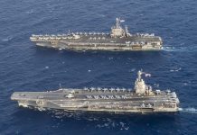 Το σύνολο των επιχειρησιακών αεροπλανοφόρων των ΗΠΑ, συνολικά οκτώ πλοία, τα οποία μεταφέρουν συνολικά περί τα 800 μαχητικά αεροσκάφη και ελικόπτερα, βρίσκονται ανεπτυγμένα αυτή...
