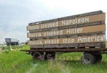 Ρωσία σταμάτησε τον Ναπολέοντα, Η Ρωσία σταμάτησε τον Χίτλερ, Ρωσία, σε παρακαλούμε, σταμάτα και την Αμερική” Αυτοσχέδια μεγάλη επιγραφή που τοποθέτησαν Γερμανοί αγρότες σε χωράφι δίπλα στο...
