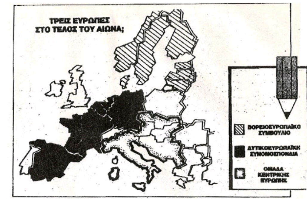 Με τον τίτλο ” Τρεις διχοτομήσης της Ευρώπης στο τέλος του αιώνα”; που παραθέτουμε στην σχετική φωτογραφία περιγράφεται η ομαδοποίηση της Ευρωπαϊκής Ένωσης σε 3 ενότητες και την αποχώρηση κάποιων χωρών από αυτήν. Η πρώτη ενότητα με το όνομα ΒορειοΕυρωπαϊκό συμβούλιο αποτελείται από τις Σκανδιναβικές και τις Βαλτικές χώρες. Σε αυτό την “ομάδα” κρατών διακρίνουμε μια έντονη αντιρωσική πολιτική εσχάτως. Η δεύτερη ενότητα είναι η “Δυτικοευρωπαϊκή συνομοσπονδία”, ο πυρήνας της Ευρωπαϊκής Ένωσης, με την Γαλλία, την Γερμανία, την Ολλανδία, το Βέλγιο, το Λουξεμβούργο και την Ισπανία να την αποτελούν. Η δεύτερη ενότητα είναι κομβική για τις αποφάσεις της Ε.Ε . Να σημειωθεί ότι η Ελλάδα απεικονίζεται εκτός της ΕΕ χωρίς σύνορα με την Βουλγαρία (!!!!) και την Ιρλανδία, την Πορτογαλία, την Πολωνία και την Μεγάλη Βρετανία εκτός της ΕΕ επίσης. ( Για την τελευταία, ήδη ο χάρτης επιβεβαιώθηκε.) Η τρίτη ενότητα που σημειωτέων είναι και ο λόγος δημιουργίας του άρθρου, ονομάζεται ” Ομάδα Κεντρικής Ευρώπης” και αποτελείται από την Ιταλία, την Αυστρία, την Ουγγαρία, την Τσεχοσλοβακία και την πάλαι ποτέ Γιουγκοσλαβία ( στο χάρτη ενωμένες). Την δεκαετία 1990-2000 ο χάρτης θεωρήθηκε αποτυχημένη πρόβλεψη και παρωχημένος, λόγω της διάσπασης των κρατών και την ένταξη πολλών εξ’ αυτών της Ανατολικής Ευρώπης στην ΕΕ, όμως η τωρινή γεωπολιτική πραγματικότητα και ο κλυδωνισμός της Ευρωπαϊκής Ένωσης τον ξαναφέρνουν στην επιφάνεια. Τι επιφυλάσσει στο μέλλον η συμφωνία Πούτιν – Τράμπ;