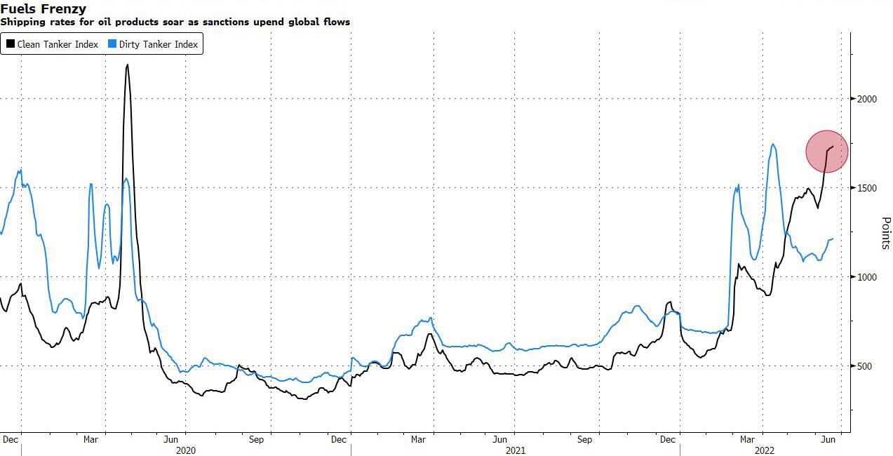Σύμφωνα με στοιχεία του Baltic Exchange, το κόστος μεταφοράς καυσίμων όπως η βενζίνη και το ντίζελ, γνωστά στον κλάδο ως καθαρό φορτίο βυτιοφόρων, έχει υπερδιπλασιαστεί, αγγίζοντας τα υψηλότερα επίπεδα από τον Απρίλιο του 2020.