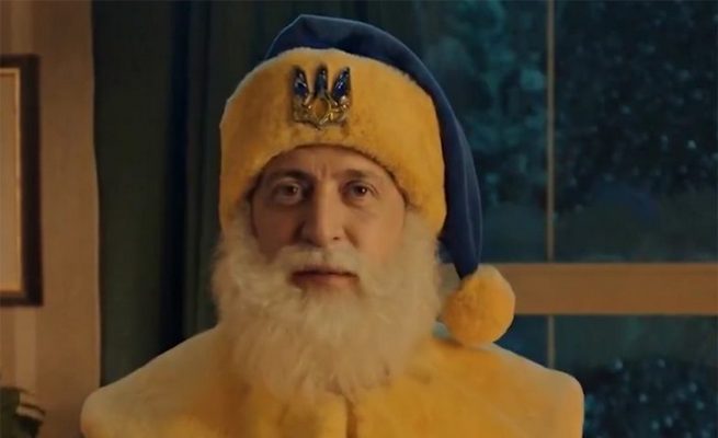 Σε επόμενα πλάνα, εμφανίζεται ο Βολοντίμιρ Ζελένσκι ντυμένος Άγιος Βασίλης και βαμμένος στα χρώματα της Ουκρανίας να αρπάζει τα δώρα από τα παιδιά, με τη φράση να επανέρχεται μονότονα: «για όλα, αγάπη μου, φταίει ο Πούτιν».