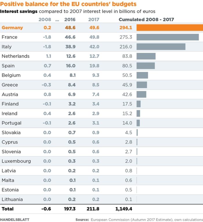«Η ομοσπονδιακή κυβέρνηση, τα κράτη και οι τοπικές αρχές είναι όλοι μεγάλοι νικητές», υποστηρίζει ο Marcel Fratzscher, πρόεδρος του ινστιτούτου οικονομικής έρευνας DIW και προσθέτει ότι «χωρίς την πολιτική μηδενικού επιτοκίου της ΕΚΤ, η Γερμανία δεν θα μπορούσε ποτέ να εξισορροπήσει τον προϋπολογισμό της».