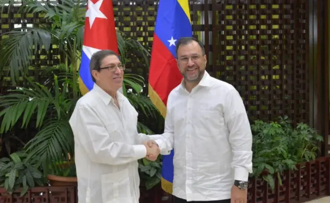 Ο Υπουργός Εξωτερικών της Κούβας, Μπρούνο Ροντρίγκεζ Παρίγια (Αριστερά) και ο Βενεζουελάνος ομόλογός του, Ιβάν Χιλ (Δεξιά).