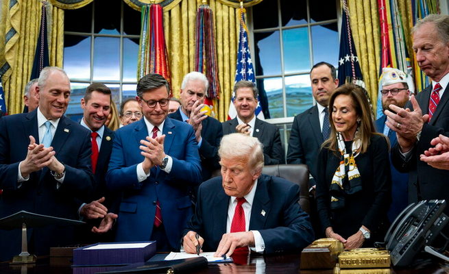 «Σήμερα στέλνουμε το σαφές μήνυμα ότι δεν υποχωρούμε ποτέ σε εκβιασμούς», υποστήριξε ο μεγιστάνας απευθυνόμενος στους δημοκρατικούς αντιπάλους του, προτού υπογράψει το κείμενο, επευφημούμενος από ρεπουμπλικάνους κοινοβουλευτικούς που τον πλαισίωναν στο Οβάλ Γραφείο.