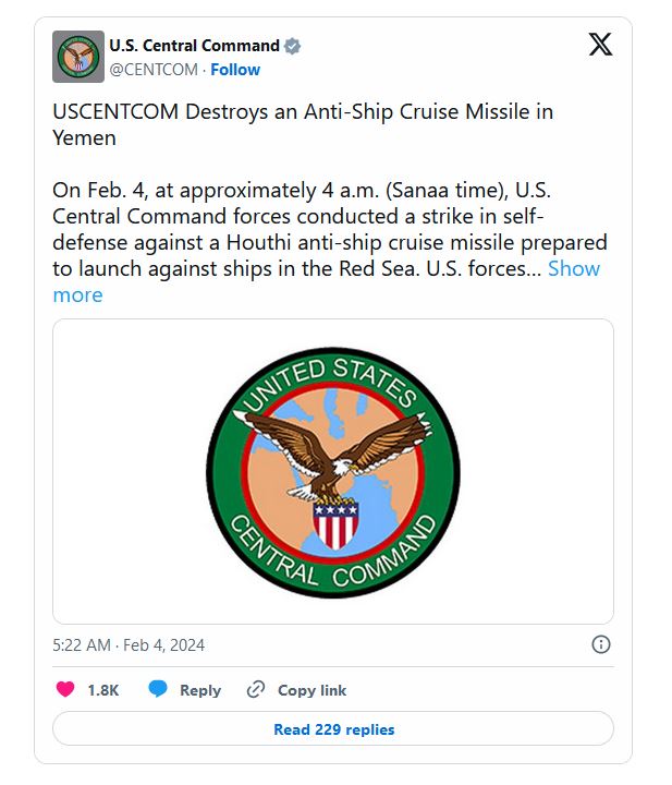 Επίσης, τα ξημερώματα της Κυριακής, ώρα 4 (τοπική, 3 ώρα Ελλάδας), οι ΗΠΑ έπληξαν και κατέστρεψαν πύραυλο κρουζ κατά πλοίων επιφανείας των Houthi που ήταν «έτοιμος να εκτοξευθεί» προς την κατεύθυνση της Ερυθράς Θάλασσας, γνωστοποίησε η CENTCOM.