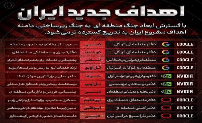 Το Ιρανικό πρακτορείο ειδήσεων Tasnim δημοσίευσε μια λίστα με γραφεία και υποδομές -με τις ακριβείς διευθύνσεις τους παρακαλώ- κορυφαίων αμερικανικών εταιρειών με δεσμούς με το Ισραήλ, και των οποίων η τεχνολογία έχει χρησιμοποιηθεί για στρατιωτικές εφαρμογές, περιγράφοντάς τες ως “νέους στόχους του Ιράν”!