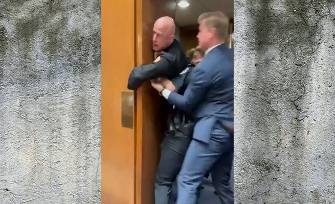 Ο υποψήφιος γερουσιαστής με το κόμμα των Πράσινων, Μπράιαν ΜακΓκίνις, φωνάζει «κανείς δεν θέλει να πολεμήσει για το Ισραήλ» καθώς αξιωματικοί ασφαλείας τον έσπρωχναν και τον τραβούσαν έξω από την αίθουσα.