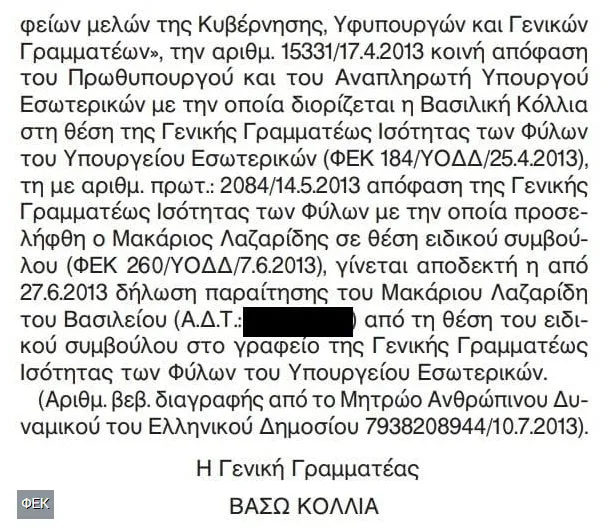 Πιο συγκεκριμένα, ο Μακάριος Λαζαρίδης στις 26 Απριλίου 2013 προσελήφθη σε θέση ειδικού συμβούλου στο Γραφείο της Γενικής Γραμματέως Ισότητας των Φύλων (ΦΕΚ Υ.Ο.Δ.Δ. 260/2013). Μετά από δύο μήνες και συγκεκριμένα στις 27 Ιουνίου του 2013, ο Μακάριος Λαζαρίδης παραιτήθηκε από την θέση αυτή, όπως αναφέρει το ΦΕΚ Υ.Ο.Δ.Δ. 343/2013 προκειμένου να προσληφθεί σε θέση δημοσιογράφου στο Γραφείο Τύπου και Δημοσίων Σχέσεων του Υπουργείου Διοικητικής Μεταρρύθμισης και Ηλεκτρονικής Διακυβέρνησης (ΦΕΚ Υ.Ο.Δ.Δ. 380/2013).