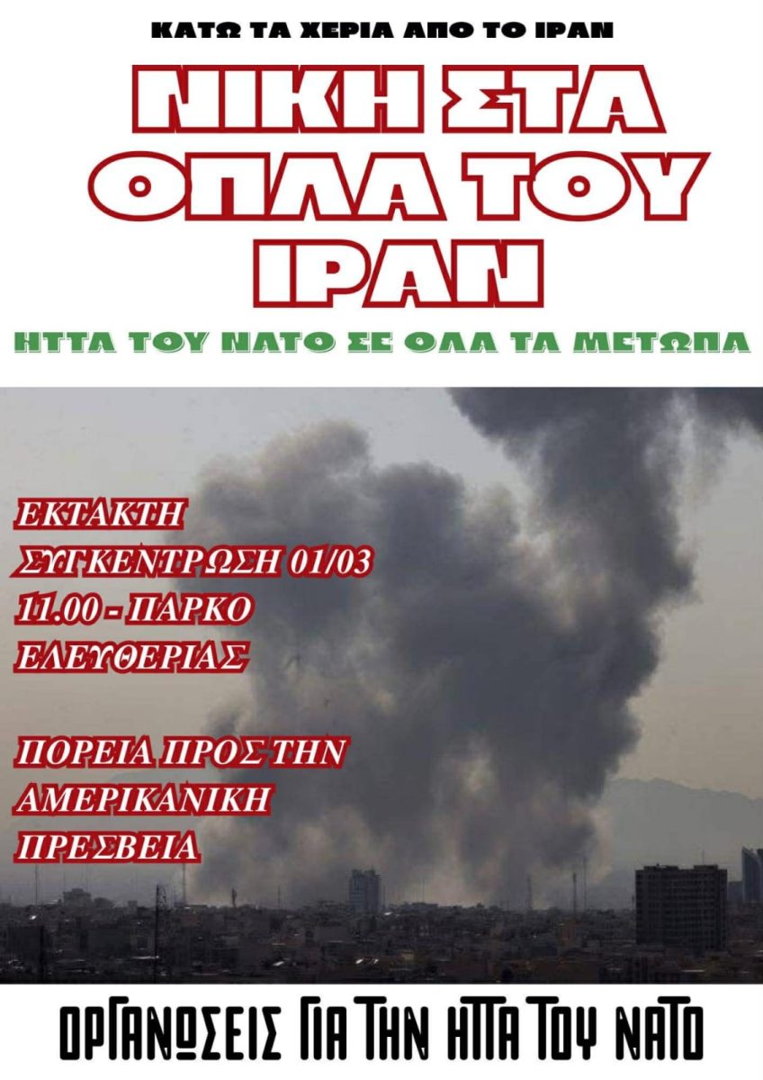 ΕΚΔΗΛΩΣΕΙΣ ΝΙΚΗ ΣΤΑ ΟΠΛΑ ΤΟΥ ΙΡΑΝ – Συγκέντρωση αλληλεγγύης, 01/03/26 11:00 Πάρκο Ελευθερίας Από iskra - 28/02/2026 57 Facebook Twitter Print Έκτακτη συγκέντρωση 01/03 11:00 Πάρκο Ελευθερίας Πορεία προς την Αμερικάνικη πρεσβεία