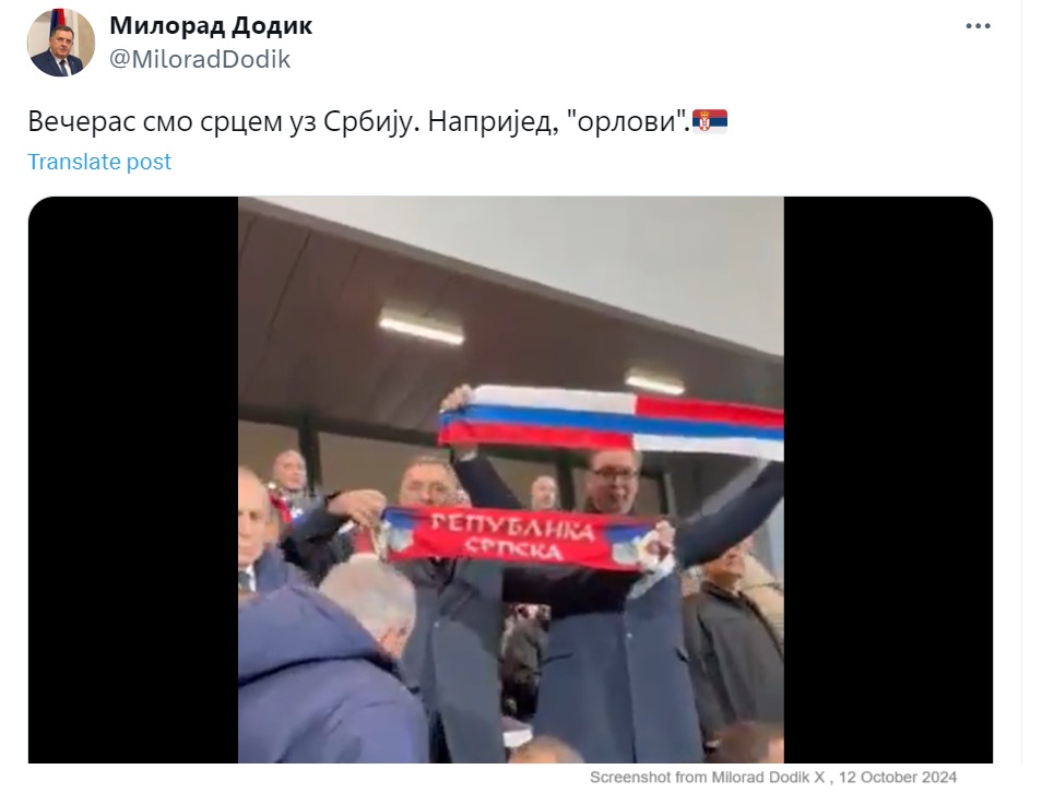 Μετά τον σάλο που προκάλεσε υπογράφοντας καταδικαστική διακήρυξη κατά της Ρωσίας όσον αφορά τις «ενέργειες στην Ουκρανία» επιχείρησε να διασκεδάσει τις εντυπώσεις, καθώς κατά τη διάρκεια του ποδοσφαιρικού αγώνα μεταξύ Σερβίας και Ελβετίας, σήκωσε σημαίες της Ρωσίας και της Σέρπσκα μέσα στο γήπεδο, αφήνοντας σαφές πολιτικό μήνυμα.