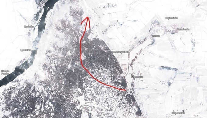 Kινούνται επάνω στην παγωμένη έκταση, από την πόλη Μαλοκατερινίβκα μέχρι το πράστιο Κουσούχουμ/Κισιγκίμ της Ζαπορίζια, πρωτεύουσας της ομώνυμης ουκρανικής Περιφέρειας, η οποία έχει ενσωματωθεί στην Ρωσική Ομοσπονδία με το δημοψήφισμα του Σεπτεμβρίου του 2022.