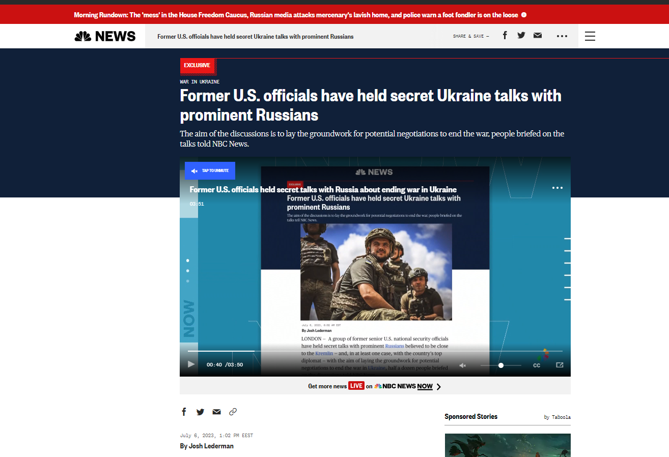 Να διαψεύσει την «αποκάλυψη» του NBC ότι πρώην αξιωματούχοι των ΗΠΑ είχαν μυστικές συνομιλίες για την Ουκρανία με εξέχοντες Ρώσους, επισημαίνοντας ότι στόχος των συζητήσεων ήταν να τεθούν οι βάσεις για πιθανές διαπραγματεύσεις για τον τερματισμό του πολέμου, ήρθε το Υπουργείο Εξωτερικών της Ρωσίας μέσω της εκπροσώπου του M. Zakharova.