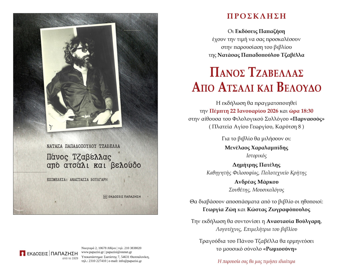 ΠΟΛΙΤΙΣΜΟΣ Πάνος Τζαβέλλας Από ατσάλι και βελούδο | Παρουσίαση βιβλίου| Πρόσκληση Από iskra - 21/01/2026 29 Facebook Twitter Print