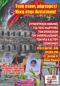 Συγκέντρωση μνήμης για τους μάρτυρες των ιμπεριαλιστικών επιθέσεων ΗΠΑ-Σιωνιστών-Τρίτη 31 Μαρτίου, 18.00 Πρεσβεία Ιράν