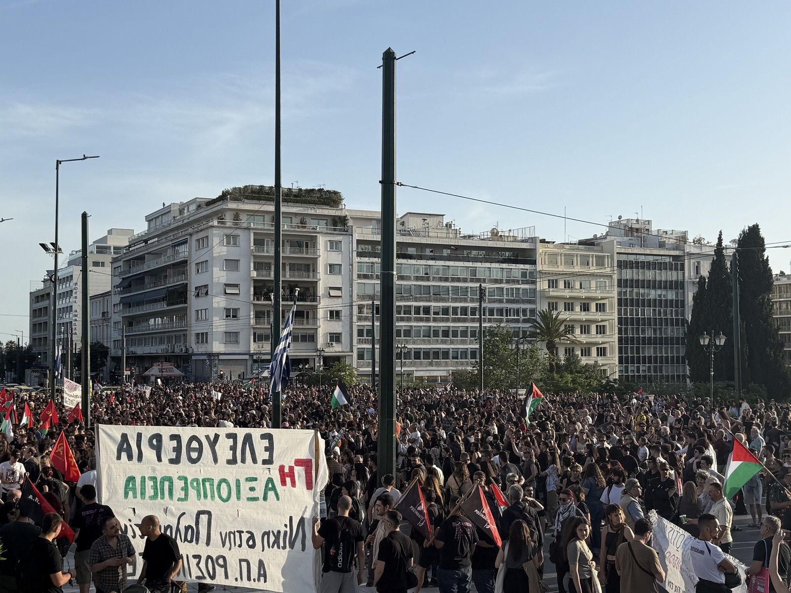 Στο Σύνταγμα συγκεντρώθηκαν σήμερα χιλιάδες πολίτες, προκειμένου να διαμαρτυρηθούν για τη συνεχιζόμενη γενοκτονία του παλαιστινιακού λαού